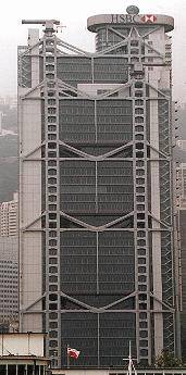 AussteifungstragwerkeAbhängig von der Höhe und Schlankheit eines Hochhauses gilt es, verschiedene Aussteifungskonzepte in Betracht zu ziehen. Dabei handelt es sich im Allgemeinen um stockwerkhohe Rahmen oder Fachwerkkonstruktionen. Bei Gebäuden oberhalb von 50 Geschossen werden Aussteifungen häufig auch zu Megastrukturen in Dimensionen von mehreren Stockwerken zusammengefasst. In diesen Megatragstrukturen "hängen" dann die eigentlichen Gebäudeeinheiten. Die Hong Kong & Shanghai Bank in Hong Kong hat ein gut sichtbares außenliegendes Aussteifungstragwerk, das auf den ersten Blick wie eine Kombination übereinandergestellter Dreigelenkrahmen aussieht, sich aber aufgrund der durchlaufenden Vierendeelträger eher als hochgradig unbestimmtes Tragwerk entpuppt. Die Kragarme haben am Ansatz doppelte Geschosshöhe und fassen das Gebäude in Blöcke zu je acht Geschossen zusammen. |