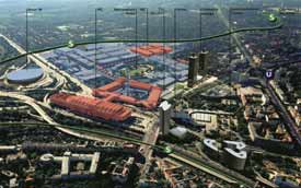 des Messegeländes, des nahe gelegenen Busbahnhofs und ICCs;