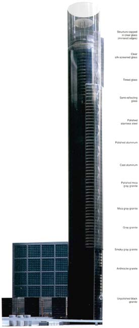 entlang des Schaftes materiell verändernde Außenhaut. In den unteren Geschossen beginnt der Tour Sans Fin mit einer Fassade aus schwarzem Granit, das sich über verschiedene hellere Granitsorten und feinere Oberflächenbehandlung zu Aluminium und später Edelstahl entwickelt, um sich schließlich in verschiedenen Glassorten optisch zu dematerialisieren.
