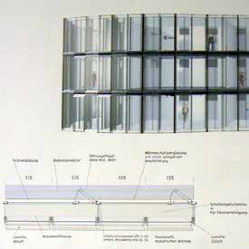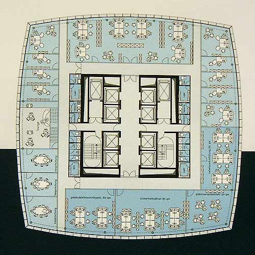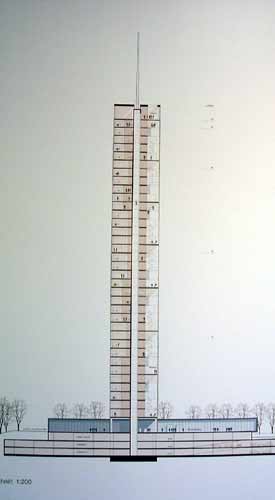 Das Hochhaus besteht aus zwei extrem schlanke Scheiben, mit einem dazwischenliegenden Kern. Fraglich bleibt die Qualität der innen liegenden Gänge beim geforderten Zellenbürokonzept. Der Entwurf verlangt eigentlich danach als in Segmente geteilter Großraum genutzt zu werden.