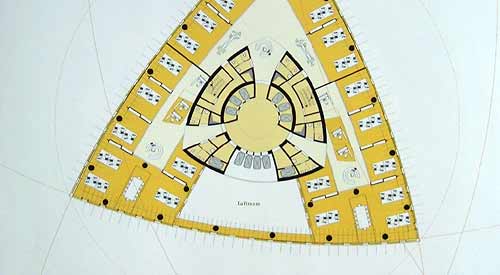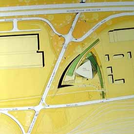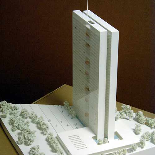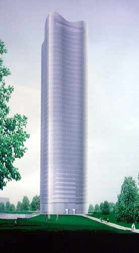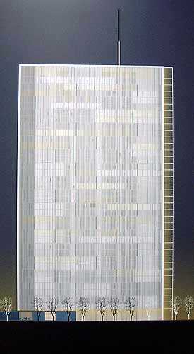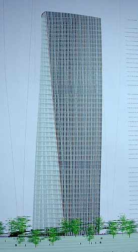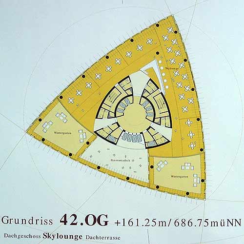 Der sich um 15° über die Vertikale verdrehende, dreieckige Grundriss erzeugt eine sehr schöne Dynamik. Die Ansicht neigt aber dazu, so zu wirken, als kippe das Hochhaus. Der Sockel greift, der vertikalen Dynamik entsprechend weit in die Landschaft. |